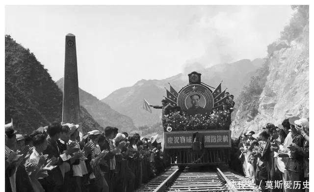 1956年的甘肃徽县。全长668公里的宝鸡到成齐的铁路,从1952年修建,历时4年建成,像片是全线解析接轨典礼。