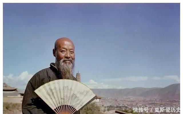 来自1959年兰州的一张像片,像片中的老者手拿折扇,心思沉静。湛蓝色的太空下有座佛塔斥地在群山之中。