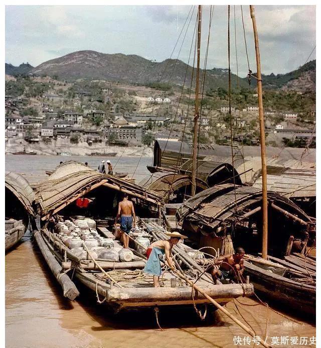 来自1959年的重庆江边的像片。渔人们在撑着船篙,船内部堆满了大缸。背后是群山环绕。