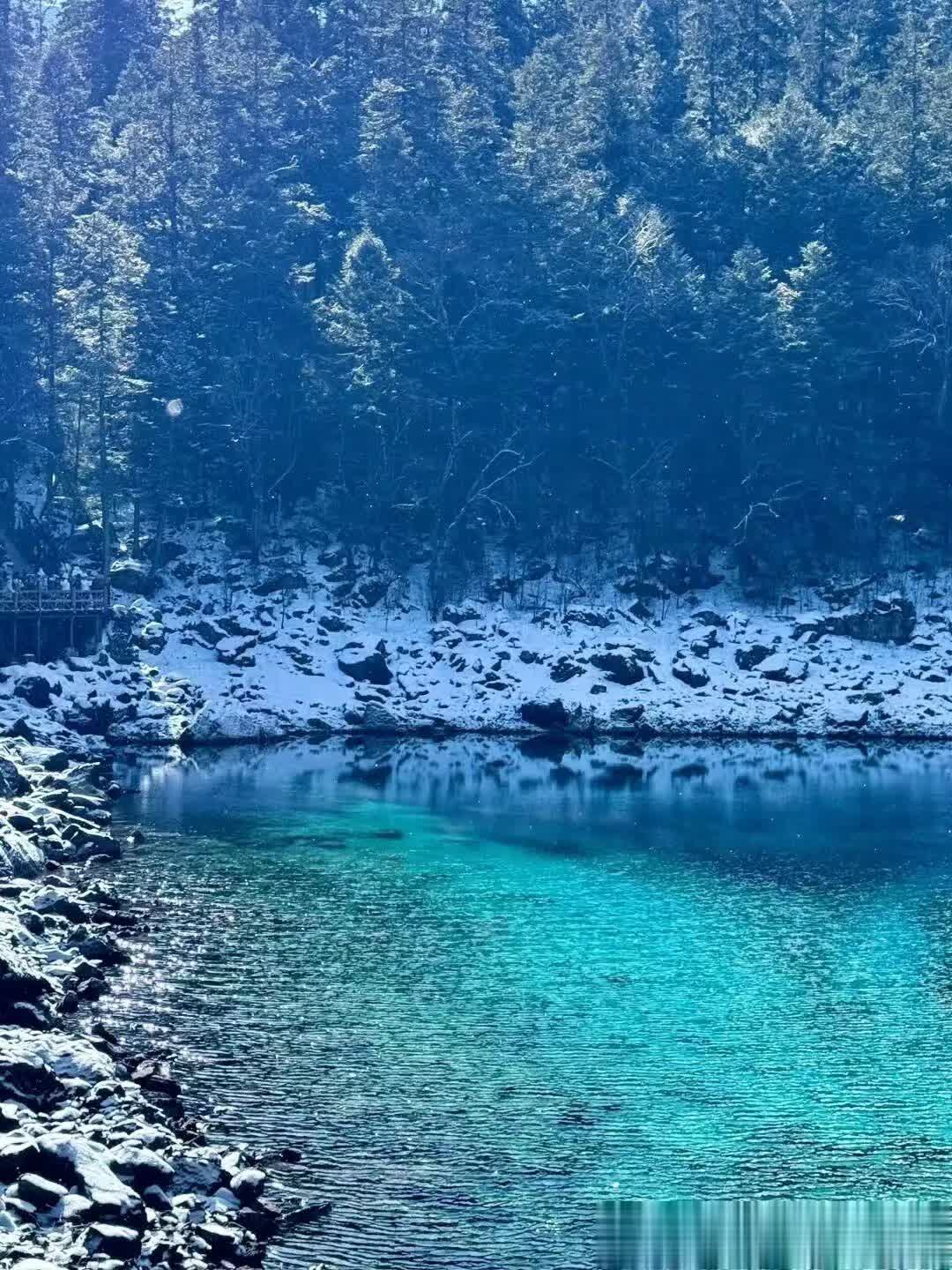 五彩池是九寨沟中最小却最娟秀的湖泊。冬天的五彩池颜色已经相配迷东说念主,湖水精通着深蓝的光芒,仿佛一颗蓝色的明珠嵌入在冰雪寰宇中,给东说念主一种宁静与秘籍的嗅觉。