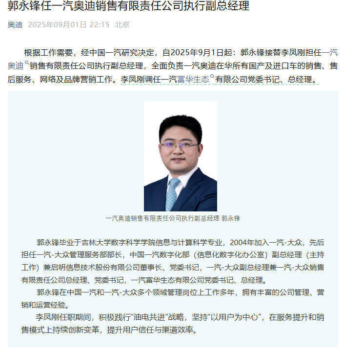 日前,一汽奥迪发布讯息称:“据责任需要,经中国一汽研究决定,自2025年9月1日起:郭永锋接替李凤刚担任一汽奥迪销售有限牵扯公司实施副总司理,全面慎重一汽奥迪在华扫数国产及入口车的销售、售后就业、收罗及品牌营销责任。李凤刚调任一汽富华生态有限公司党委通知、总司理。”