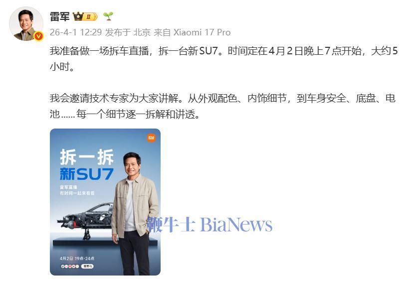 4月1日音问,雷军当天晓示,4月2日19~24时,作念一场拆车直播,拆一台新SU7。