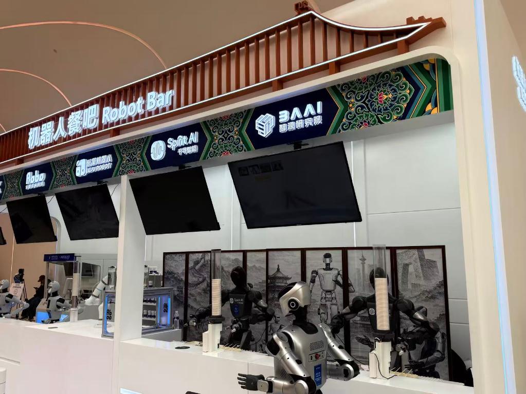 来自不同公司的机器东谈主在“机器东谈主餐吧”内服务。新华社记者 张骁 摄
