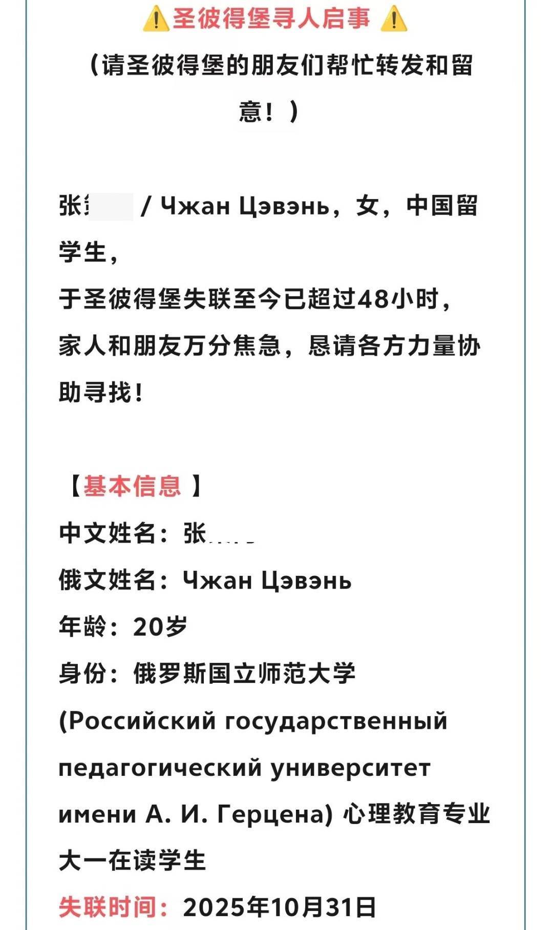 据张某某父亲发布的寻东谈主视频,张同学,女孩,年纪20岁,为俄罗斯国立师范大学心情教养专科大一在读学生,失联技术为10月31日,失联所在为俄罗斯圣彼得堡市,终末出目放学校教养楼近邻。
